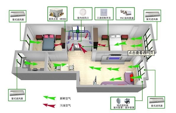 其工作原理為“強(qiáng)制排風(fēng),自然進(jìn)風(fēng)”,即由安裝在浴室衛(wèi)生間等吊頂上方的新風(fēng)機(jī)持續(xù)向外排風(fēng),使室內(nèi)產(chǎn)生負(fù)壓;在負(fù)壓源的引導(dǎo)下,室外新風(fēng)經(jīng)安裝在客廳、餐廳、臥室、書房等處外墻或窗戶上的進(jìn)風(fēng)口進(jìn)入室內(nèi)。